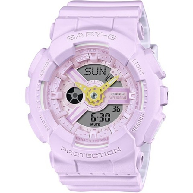 商品は国内正規品で完全新品です。 メーカー保証書にゴム印を押し、1年間有効のメーカー保証書を発行いたします。 付属品 メーカー保証書(発送日より1年)、説明書、ボックス、タグ CASIO(カシオ計算機株式会社) BABY-G BA-110AH-4AJF アクティブな女性に向けた耐衝撃・カジュアルウオッチBABY-Gから、柔らかなソフトカラーを纏ったデザインで、日常に彩りを添えるモデルです。 ベースモデルには、文字板やインデックスなど様々なパーツを複雑に組み合わせたデザインが特徴のBA-110を採用。 柔らかなパステル調のカラーを纏ったモデルに、針の色には鮮やかなポップカラーの差し色を施しました。遊び心あるカラーコントラストが気分を明るく盛り上げます。 耐衝撃構造や10気圧防水機能など、日常のアクティブシーンに欠かせない頼れる機能も充実。日常生活はもちろん、スポーツやレジャーシーンも安心。アクティブな毎日を応援します。 商品仕様 ケースサイズ(縦×横×厚さ) 46.3 × 43.4 × 15.8 mm 質量 45 g ケース・ベゼル材質 樹脂 バンド 樹脂バンド 構造 耐衝撃構造(ショックレジスト) 防水性 10気圧防水 使用電源・電池寿命 電池寿命:約2年 時計機能 ワールドタイム ワールドタイム:世界48都市(29タイムゾーン、サマータイム設定機能付き)+UTC(協定世界時)の時刻表示 ストップウオッチ ストップウオッチ(1/100秒、24時間計、スプリット付き) タイマー タイマー(セット単位:1分、最大セット:24時間、1秒単位で計測) アラーム 時刻アラーム5本(1本のみスヌーズ機能付き)・時報 ライト LEDライト(残照機能付き) ライトカラー LED:アンバー カレンダー フルオートカレンダー 操作音ON/OFF切替機能 操作音ON/OFF切替機能 精度 平均月差:±30秒 その他 12/24時間制表示切替 Domestic(Japan) warranty only. PayPal payment ONLY.
