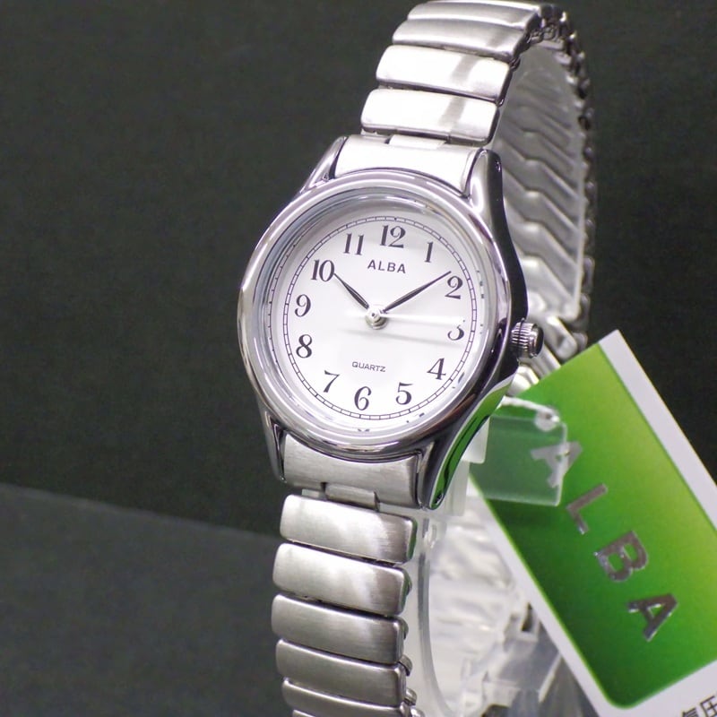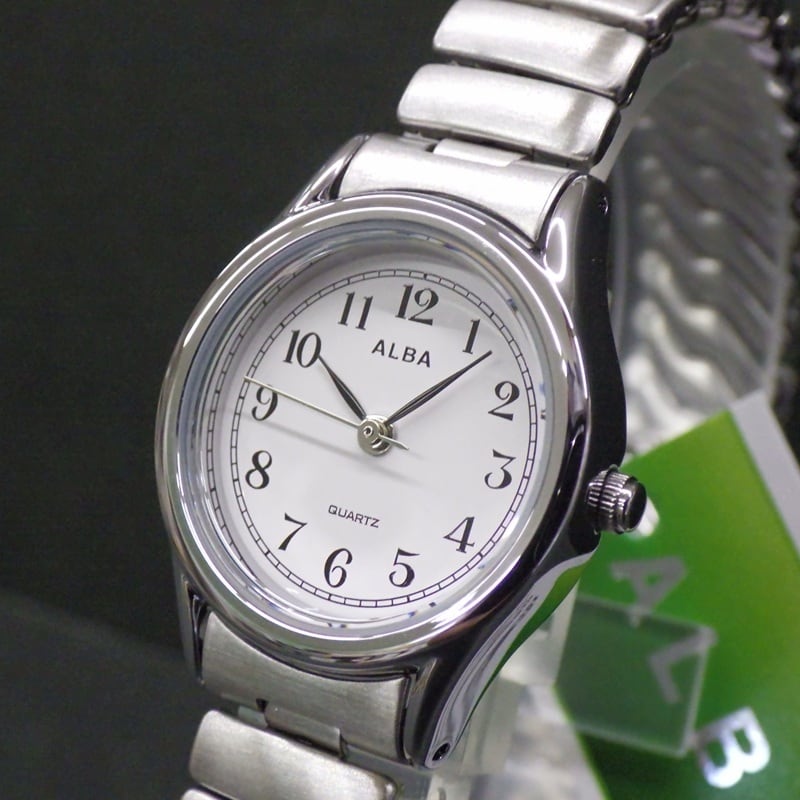 SEIKO セイコー ALBA アルバ AQHK439 シルバー 蛇腹 伸縮ベルト Sバンド 白文字盤 アラビア数字 レディース 腕時計