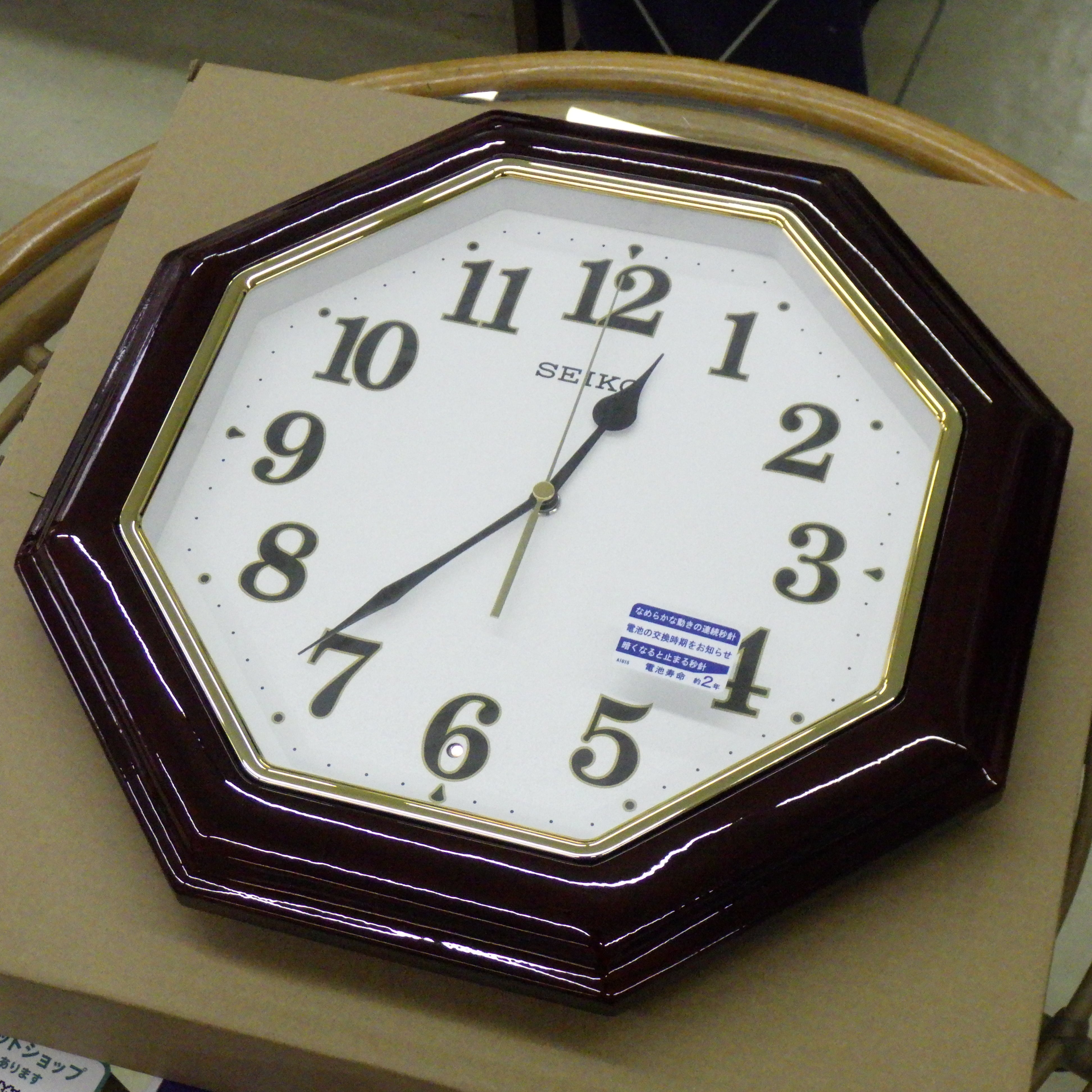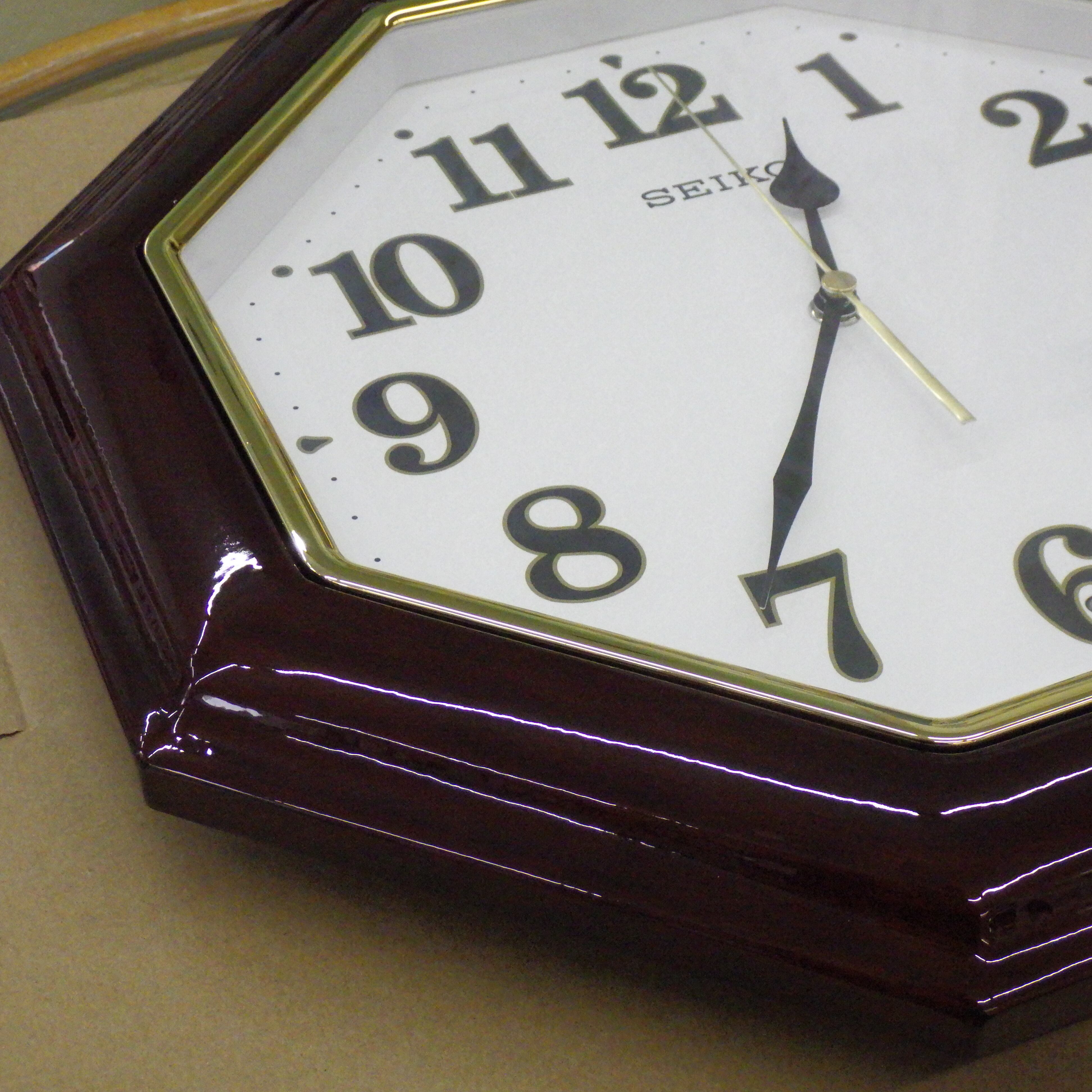 木枠は光沢有りのダークブラウンです。木枠内側は金色の金具で縁取りされていて重厚なデザインとなっております。玄関や応接室など来客の方をもてなす場に相応しい時計です。