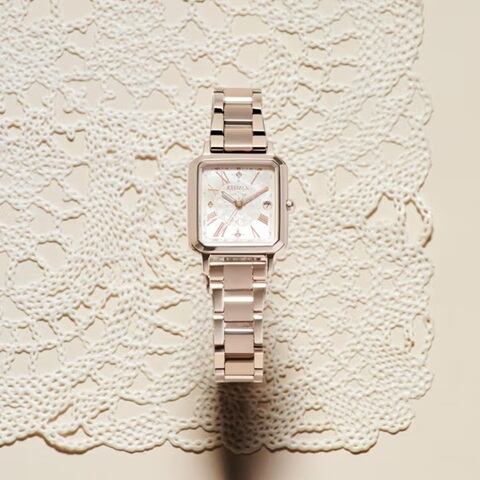 やさしくフェミニンな印象を与える、サクラピンク®のスクエアケースに、クラシカルで華やかな白蝶貝文字板を組み合わせたモデル。