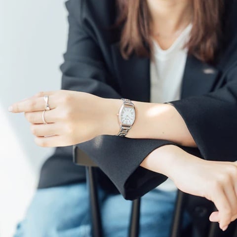 「inner star」をテーマにしたベーシックなトノー型モデル。デザインテーマである「inner star」には、「自分の中にスターを持つことで自信を持ち、前に進めますように」という想いを込めています。文字板中央に小さな幾何学形状を組み合わせたチェックのパターンを描き、繊細なきらめきを表現。1、5、7、11時位置に中央からはじけるような形状のインデックスを配置し、軽やかさを演出しています。