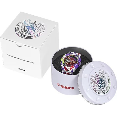 G-SHOCK全体にエヴァンゲリオン初号機が描かれ、12時側のバンドには初号機の頭部装備である角、ベゼル部分には初号機の顔、ベゼル下部から6時側のバンドにかけてはロンギヌスの槍を投擲しようとする左腕がデザインされています。