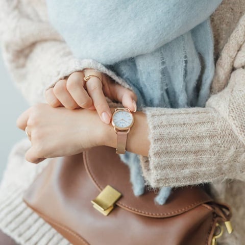 「冬の澄んだ空気」をイメージした透明感あふれる限定モデル。白蝶貝文字板にシンプルなバーインデックスを組み合わせた、アクセサリー感覚で使用できる1本です。12時の位置には2ポイントのクリスタルガラス、2時と8時位置のインデックスには雪のきらめきを表現したさりげない装飾をプラス。その日のメイクやファッションに合わせて印象を変えられる、グレージュの替えバンドをセットした2way仕様です。ご自身でバンドの付け替えができるインターチェンジャブル構造を採用しています。