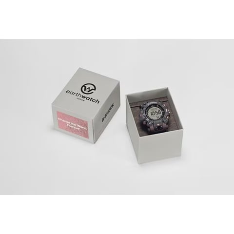 EARTHWATCH Japanの呼びかけの言葉「Change the World. Yourself.」をバンドに、ロゴマークを遊環に印刷。LEDバックライトにもロゴがを用い、裏蓋にはシンボルマークを刻印。