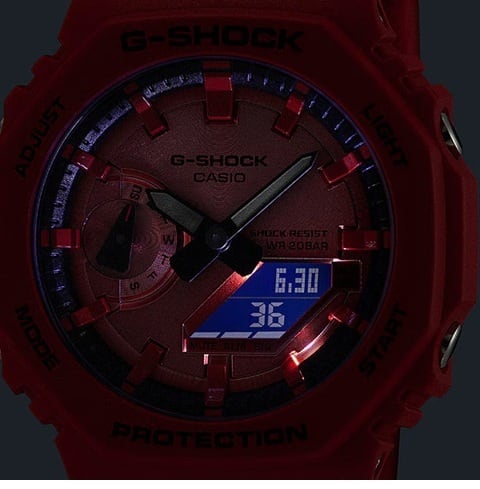 時計のフェイスに施された赤の色合いがバンドやベゼルと調和し、力強く質感のコントラストが印象的なデザインに仕上がっています。液晶は反転液晶で、各所にブラックを取り入れることでデザイン性を高めています。ブラックのアクセントカラーが赤を引き立て、G-SHOCKのアイデンティティを表現しています。