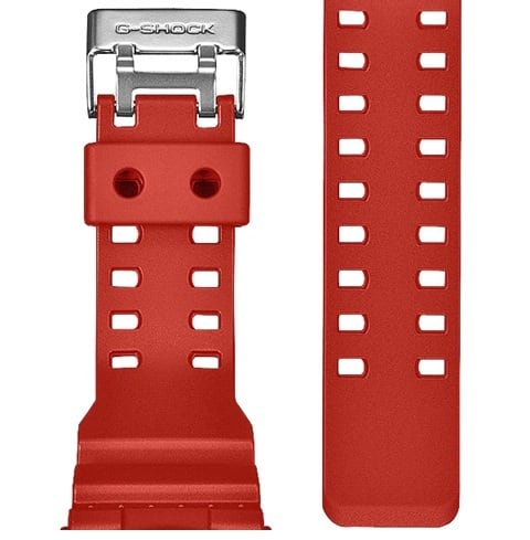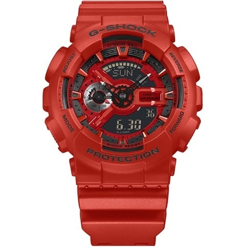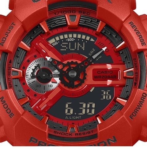 時計のフェイスに施された赤の色合いがバンドやベゼルと調和し、力強く質感のコントラストが印象的なデザインに仕上がっています。液晶は反転液晶で、各所にブラックを取り入れることでデザイン性を高めています。ブラックのアクセントカラーが赤を引き立て、G-SHOCKのアイデンティティを表現しています。