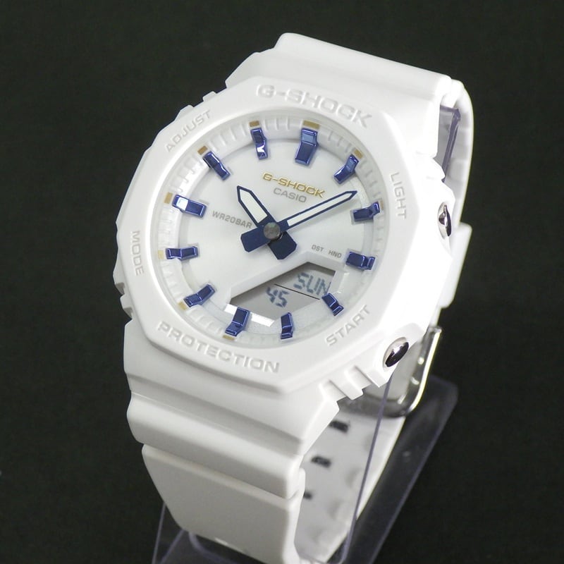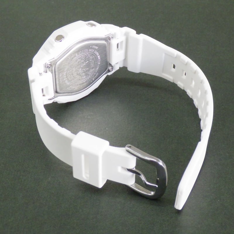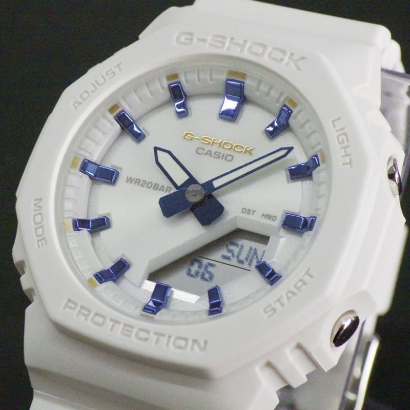 ダイアルに透明蒸着を施し質感を高め、インデックスにはブルー蒸着を施し、シルバー・ゴールドの差し色が華やかさを演出。マットホワイトのベゼルとバンドに、G-SHOCKロゴおよびアワーマーカーのゴールドが特別感を添えます。裏蓋にはラ「天使&悪魔」を刻印。大切な人との絆を見守ります。