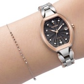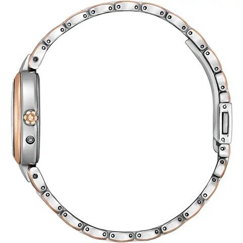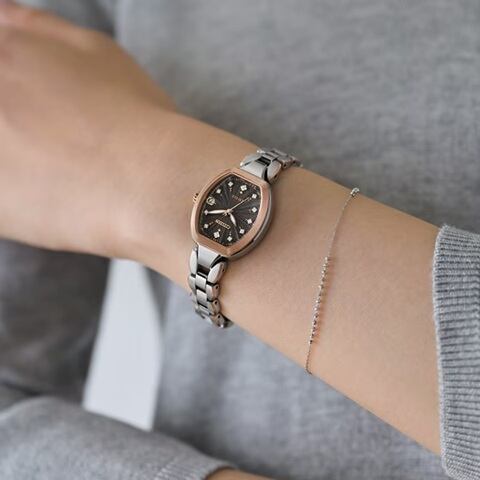 人気のあるお花をモチーフにしたバンドに、ピンクゴールドのベゼルを合わせたツートン仕様。柔らかく広がる光をデザインに込め、新しいときを感じる表情に仕上げました。文字板にはシルバーのラメを練り込み、中央から光が広がるような放射パターンを組み合わせ、華やかさと奥行きのある幻想的なデザインに。放射パターンに沿って、11ポイントのダイヤモンドをあしらった限定モデルです。