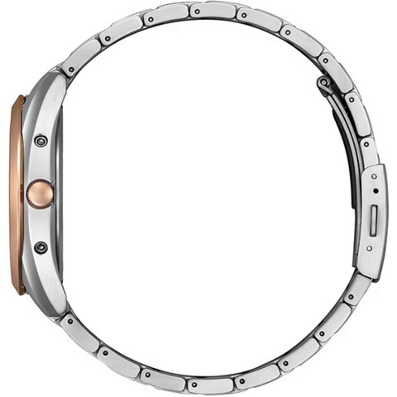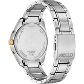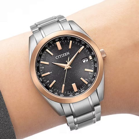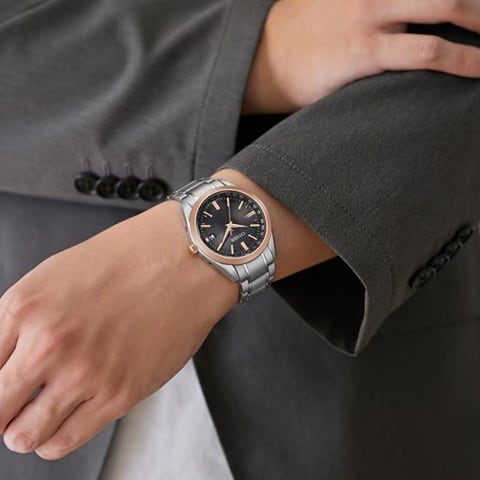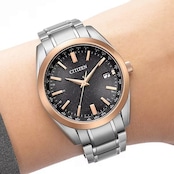 CITIZEN COLLECTIONでは唯一、ケースとバンドにスーパーチタニウム™を採用した、ベーシックな3針モデルをアレンジ。ピンクゴールドのベゼルを合わせたツートン仕様で、普段使いしやすい色合いの中に華やかさと限定感をプラスしました。インデックスと針はベゼルに合わせたカラー、文字板にはピンクのラメを入れることで、柔らかな輝きと上品な印象を与えます。