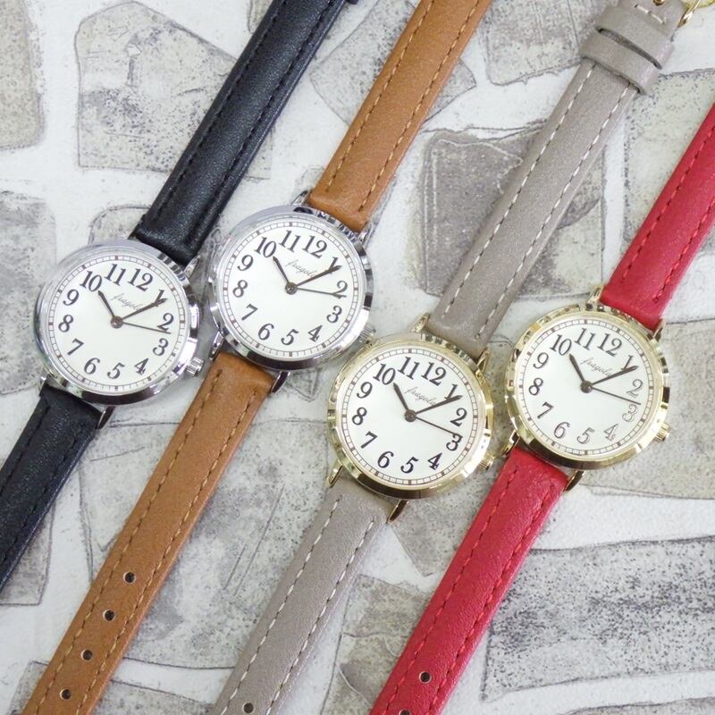 シンプルなのにどこか懐かしい、クラシカルなインデックスが目を惹く腕時計です。数字・針・メモリがはっきりした落ち着いたデザインで、時計の見やすさも抜群◎ 小ぶりなので学生から大人まで、幅広く使いやすい1本です。