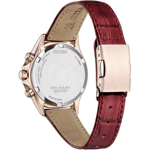 インデックスにはローマ数字を採用し、すっきりとした印象に仕上げました。型押しされたダークレッドの革バンドが上質感を高め、手元を美しく、女性らしく引き立てます。
