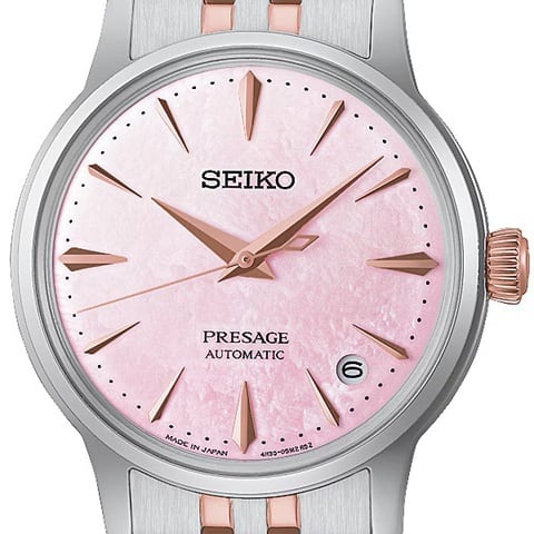 ピンクゴールドカラーの針、インデックス、りゅうずとツートーンカラーのブレスレットを採用し、モデル全体で華やかな桜の季節を感じさせます。