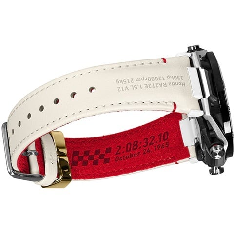 Hondaの全面協力を得てRA272を徹底研究。本物の「チャンピオンシップホワイト」塗料をベゼルに用い、60分位置には60周年にちなみ金色の「60」を刻印。文字板外周の赤いラインはRA272に描かれた日の丸をイメージしています。