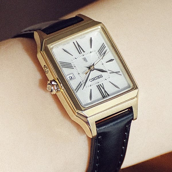 バランスの良い長角フォルムは堅苦しくなりすぎず、ワークシーンのジャケットスタイルから、オフのワンピーススタイルまで幅広いシーンで活躍する万能ウオッチです。「カラーリリー」のフォルムをモチーフにしたりゅうずがアクセントとして輝く上質なデザインです。