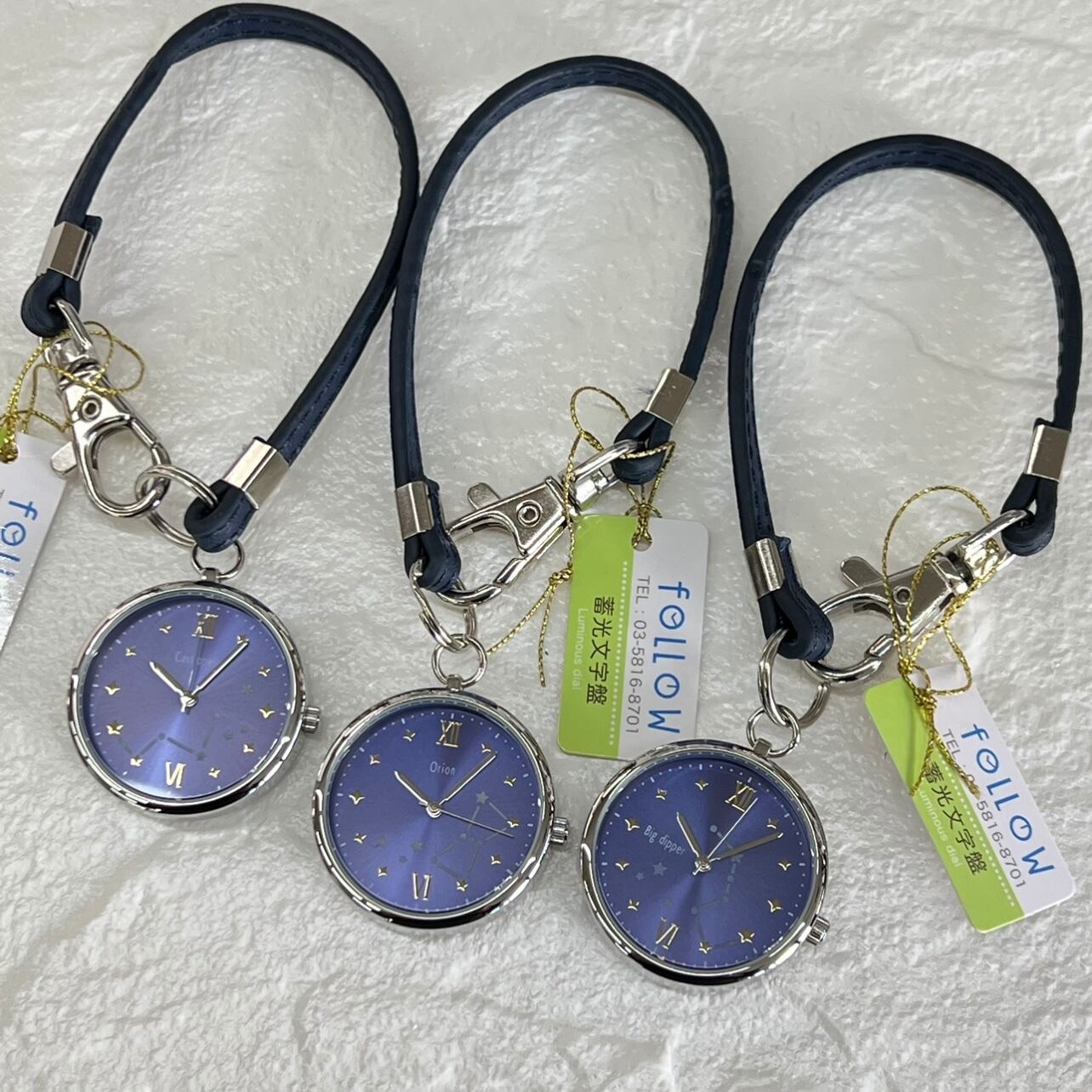 暗い場所で星座や星が光るのを楽しめる蓄光文字盤を使用したアイテムです。バッグなどにつけてすぐに時間を確認できるので、外出のお供にピッタリです。