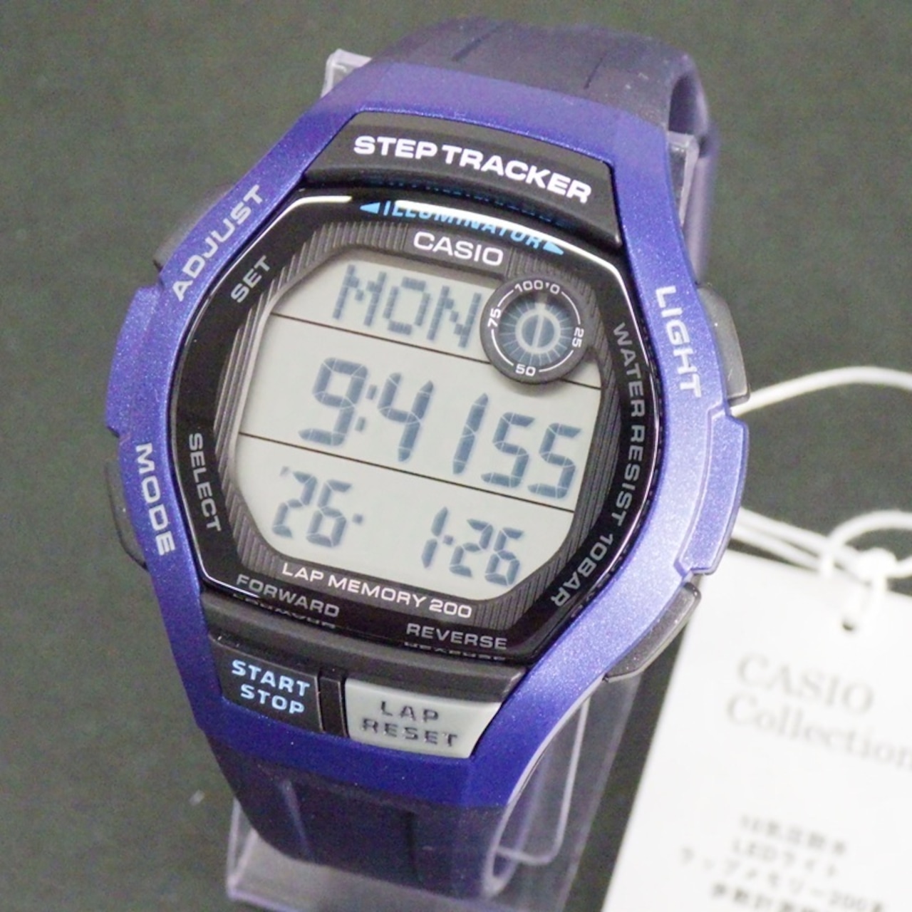ストップウオッチ(1/100秒(1時間未満)/1秒(1時間以上)、24時間計、ラップ/スプリット付き、計測データを最大200本メモリー(計測月・日・時・分、ラップ/スプリットタイム))