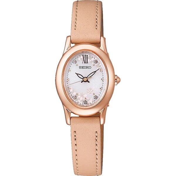 5時位置に配置した大きめの桜がデザインのアクセントになっています。そして、ピンクゴールドカラーのケースに淡いベージュのストラップを合わせました。