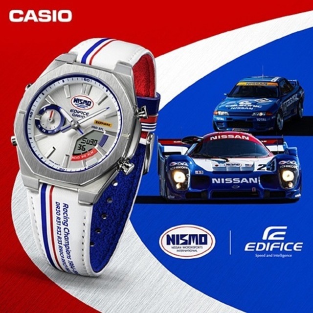 ★12/28日(日)正午までのタイムセール★ ★通常販売価格より20%OFF 35,200円(税込)★ 商品は国内正規品で完全新品です。 メーカー保証書にゴム印を押し、1年間有効のメーカー保証書を発行いたします。 付属品 メーカー保証書(発送日より1年)、説明書、ボックス、タグ CASIO(カシオ計算機株式会社) EDIFICE(エディフィス) ECB-S10NIS-7AJR カシオ、日産自動車、NISMOが共同で企画したEDIFICE NISMOヘリテージエディションは、NISMOのレース魂をそのまま腕時計に刻み込んだ特別なモデルです。 初代NISMOロゴを採用し、日産ワークスチームのカラーであったトリコロールがダイアルやバンドに映し出されています。バンドの裏側にも青と赤のトリコロールが施され、遊環には初期ユニフォームのストライプを再現。文字板上部の蓄光ロゴは、24時間レースのグループCレース車両の蓄光カーナンバーを思わせます。 さらに、1984年から1997年までの間にシリーズチャンピオンを獲得した名車への敬意を込めて、バンドにはその各車名が印刷されています。富士1000kmレースで活躍したNISSAN R92CPの鯉のぼりデザインや、R32スカイラインの「ハチマキ」をイメージしたオレンジの帯など、細部にまでこだわりました。 機能面ではスマートフォンリンク機能を搭載し、時刻の正確な調整やアプリによる操作が可能です。 9.6mmの薄型ケースは装着感が軽く、サファイアガラスと10気圧防水で耐久性も兼備。 EDIFICE NISMOヘリテージエディションは、NISMOファンの心に響く究極の時計です。 基本情報 ケースサイズ(縦×横×厚さ) 48 × 43 × 9.6 mm 質量 69 g ケース・ベゼル材質 ステンレススチール バンド 本革/合成皮革バンド 防水性 10気圧防水 使用電源・電池寿命 電池寿命:約2年 モバイルリンク/アプリ連携機能 モバイルリンク機能 モバイルリンク機能(対応携帯電話とのBluetooth通信による機能連動) アプリ 「CASIO WATCHES」対応 アプリ連携機能 自動時刻修正 簡単時計設定 ワールドタイム約300都市 タイム&プレイス 携帯電話探索 外装 ガラス サファイアガラス バンド装着可能サイズ 175~215mm 時計機能 ワールドタイム ワールドタイム:世界38都市(38タイムゾーン、サマータイム自動設定機能付き)+UTC(協定世界時)の時刻表示、ホームタイムの都市入替機能 ストップウオッチ ストップウオッチ(1/100秒(1時間未満)/1秒(1時間以上)、24時間計、スプリット付き) タイマー タイマー(セット単位:1秒、最大セット:24時間、1秒単位で計測) アラーム 時刻アラーム5本・時報 ライト ダブルLEDライト: 文字板用LEDライト(スーパーイルミネーター、残照機能、残照時間切替(1.5秒/3秒)付き)、 LCD部用LEDバックライト(スーパーイルミネーター、残照機能、残照時間切替(1.5秒/3秒)付き) ライトカラー LED:ホワイト カレンダー フルオートカレンダー 操作音ON/OFF切替機能 操作音ON/OFF切替機能 精度 ※スマートフォンと連携しない場合は、通常のクオーツ精度(平均月差±15秒)で動作します。 その他 12/24時間制表示切替 日付表示(月/日表示入替) 曜日表示(英・西・仏・独・伊・露の6ヵ国語切替) 針退避機能(針が液晶表示と重なって見づらいときは、針を液晶表示の上から一時的に退避させることができます) Domestic(Japan) warranty only. PayPal payment ONLY.